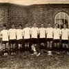 Ramsing:fodboldhold foran det 6 kantede forsamlingshus.