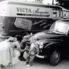 Kvinde i kjole står bukket over sin datter. Til højre står en anden lille pige foran en Morris 1000. Bagerst holder en varevogn med reklame for Victa Margarine, Vejle Margarinefabrik.