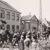 Tyske soldater marcherer ved Byskolens gymnastiksal i begyndelsen af Besættelsen 1940-45
