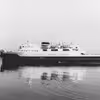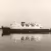 Bilfærgen "Broen" i automobilfærge- lejet i Nyborg. I baggrunden damp- færgen "Prins Christian"