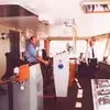 Overmatros Frede Hansen til rors på M/F "Broen".