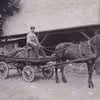 Kusk og mælkedreng på hestetrukken mælkevogn fra Korsør Mejeri foran Banegårdspladsen. Reklameskilt for Jerseymælk og sødmælk
