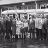 Korsør. 19 personer: to kvinder, to drenge og 15 mænd foran turistbus, der står foran garage.