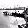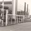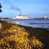 Scanglas A/S med glasværket, tilløbet skib og kraner set fra Lilleøvej eller Kulgårdsvej