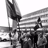 1. Maj demonstration. Optogets fanebærere ud for Ansgarkirken. Boligkomplekset "Enighedslund", Vesterbro 1-15 i baggrunden.