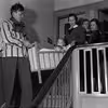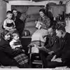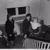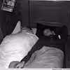 Folk på vej ned i beskyttelsesrum med barneseng