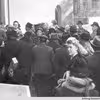 Folk på vej ind i beskyttelsesrum i Aalborg Bys- og Omegns Sparekasse, Østerågade.