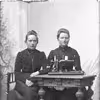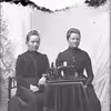 Christensen, Karoline. Syerske. 2 siddende kvinder ved bord med symaskine.