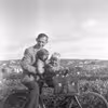 Ukendt kvinde med sin cykel, barn på sadlen.
