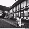 Aalborghus Slot, to ukendte kvinder står ved en cykel i slotsgården.