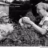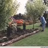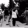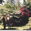 Havebesøg hos Gunner Vestergaard. Personer besøger Gunner Vestergaards have. En af dem bærer en trøje med logoet, Det jydske Haveselskab