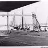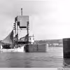Opførelse af den nye jernbanebro, en fiskekutter passerer åbningen.