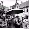 Fire friske sneryddere i Fjordgade. Retsbygningen, Gabelsgade, ses i baggrunden.