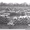Eternitfabrikken, rør liggende i stabler. Kolonihaver i baggrunden.