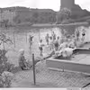 Det indhegnede soppebassin i Østre Anlæg, Sankt Markus Kirke i baggrunden.