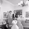 Gruppefoto, forældre samlet i stuen med to døtre.