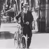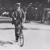 Med stråhat og på cykel.