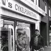 Jørgens Cykelforretning, Nørregade 34, Hirtshals, med ejer Jørgen Nielsen fotograferet med vinderen af en Bugatti cykel.