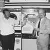 Hjørring Dyrskue 1990. Borgmester P.S. Poulsen og Bent Jørgensen fra Landøkonomisk Selskab stiger af hestetrukket køretøj.