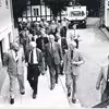 Borgmester Poul S. Poulsen gående på torvet med norsk trafikudvalg på besøg. T.h. med piben i hånden stadsingeniør Hans G. Kjær. m.fl.