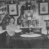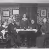 Siddende omkring bordet i stuen.
