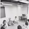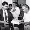 Borgmester Knud Størup, Hirtshals, overrækker gave til forstander for VUC i Hjørring, Kresten Kjærsgaard. I midten af billedet Jørgen Fønss, lærer ved VUC.