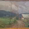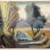 Erik Larsen. Landskab med gård. Tusch og akvarel