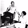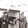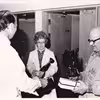Narkoseoverlæge R. Aurup hilser på de to første bloddonorer på det nye sygehus. Elin Bjørnholt, Aars og Ludvig Nielsen, Farsø