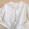 Hjemmesyet bluse med hulmønster, broderi, blonder og fine røde glasknapper, der var beregnet til afmontering ved vask