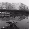 Brøndby Strandplanen ved lavhusene på en regnvejrsdag. Mudder og kæmpevandpytter.