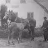 Hans Christian Brams med to heste og føl foran hjemmet "Bakkely",