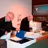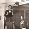 Ole Kaj Jensen og Svend Aage Sørensen forbereder sig på revyoptræden ved Gærum lokalhistoriske Forenings generalforsamling, april 2012.