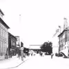 Jernbanegade, med den gamle banegård for enden af gaden og Bechs hotel på højre side af gaden (på fotoet).