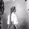 Ung pige med to meget lange fletninger ned ad ryggen.