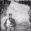 Ukendt herre med bowlerhat og hund ved et buskads.