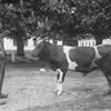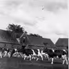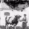 En mand med en sortbroget ko i snor ved en stald.