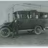 Rutebilejer Hans Peter Hansen ved sin rutebil, der kørte på ruten Køge-Ejby-Viby. Billedet er taget ved Viby Station. Ruten blev forlænget til Viby i 1925.