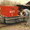 Postkort fra Blovstrød Banen:15 års jubilæumsdag på Blovstrød H. RVT 1 og lokomotivet "Klingenberg" ved vingehjulet.