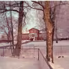 Kirkehavegård i sne fra forskellige vinkler