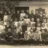 Skoleelever og lærer foran skolebygning