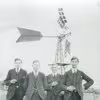 4 unge mænd ved Handermelle, med en vindmølle i baggrunden formentlig en vandpumpe til afvanding.