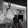 Gammel gaslygte på Præstø Kirke og skæv skorsten på Torvet, 1959, Præstø