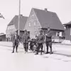 4 soldater stillet op til fotografering på Brovejen, med gammel barnevogn, og en med stok.
