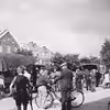 Englænderne ruller forbi på Brovejen med hilsende danskere på begge sider. Antagelig ud for Hindsgavls marker.