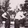 Kaj Chr. Ove Hansen og Alfred Frederiksen stående i haven, muligvis i haven ved deres forældre i Vejlby Fed.