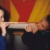 Julemarked i Middelfart 1996. To ukendte drenge spiser en kæmpe hotdog foran banner med Kvicklys logo.