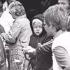 Spejdere ved bålplads i en by. Til højre ses kørelærer Bent Larsen. Lokationen er et torv i en by.