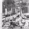 Torvekiosken ved K. Goldenbek under nedrivning. Mod venstre ses ventesalen til rutebiler, længere mod venstre ses en bygning tilhørende rutebilstationen, og nede på Havnegade ses et pakhus.