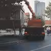 Middelfart Torv, nedtagning og bortkørsel af Helges Pølsevogn. (Helge Johansen)