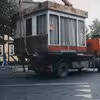 Middelfart torv. Nedtagning og bortkørsel af Helge Johansens pølsevogn.